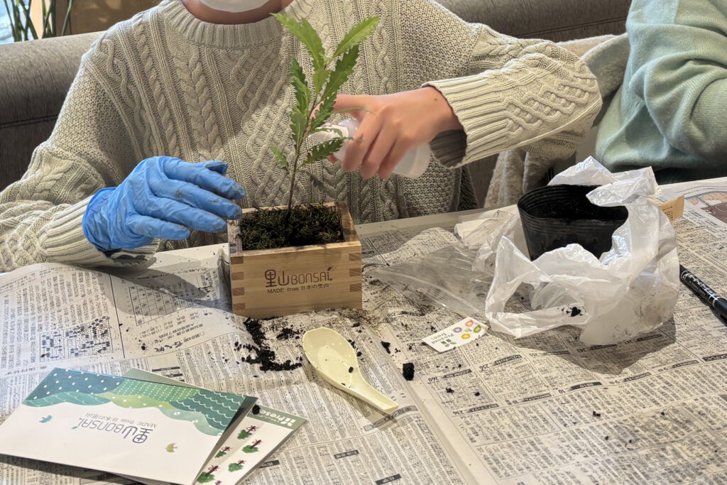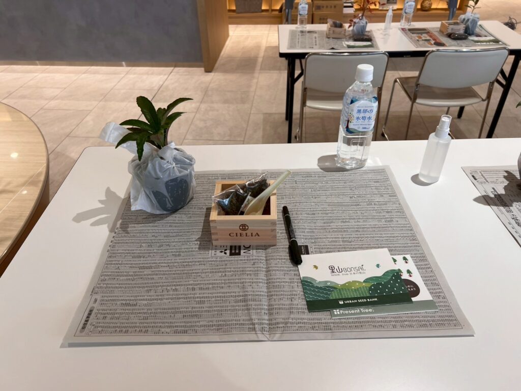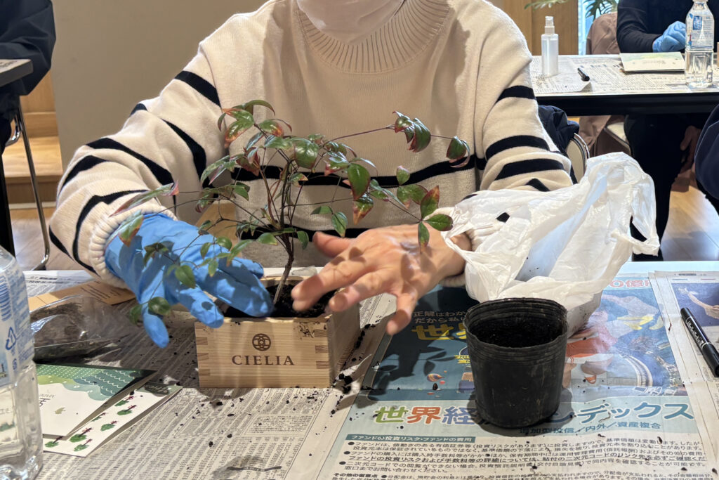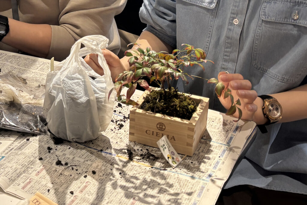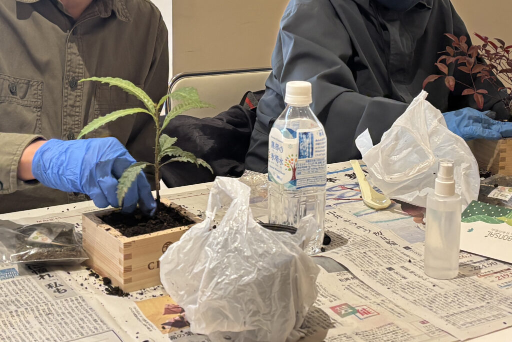 ■里山BONSAIづくりの様子。CIELIAロゴの入ったオリジナルの桝がカッコイイ!