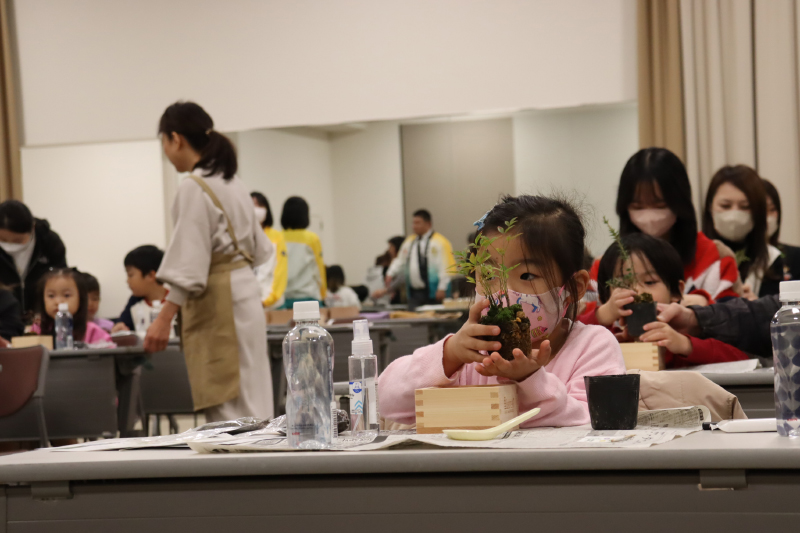 受付が始まると、会場は親子連れで大賑わい♪ 小さな赤ちゃんから大きなお姉ちゃんまで、親御さんだけでなくおじいちゃんおばあちゃんにもご参加いただき、昨年以上の熱気です。ヒメヒイラギ、センリョウ、マンリョウから好きな苗木を選んで、着席してもらいます。
