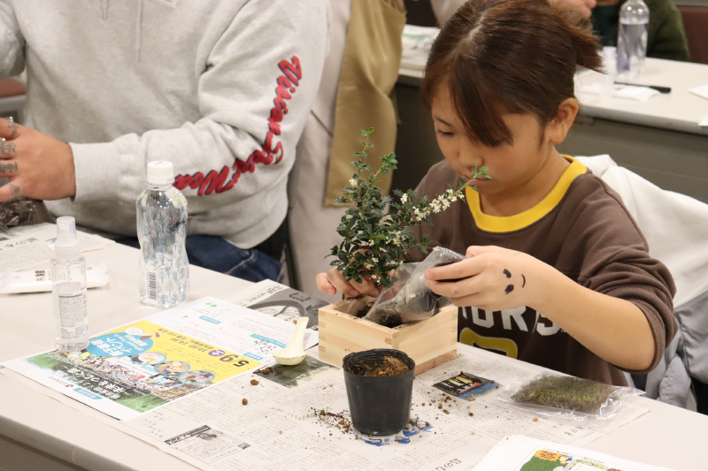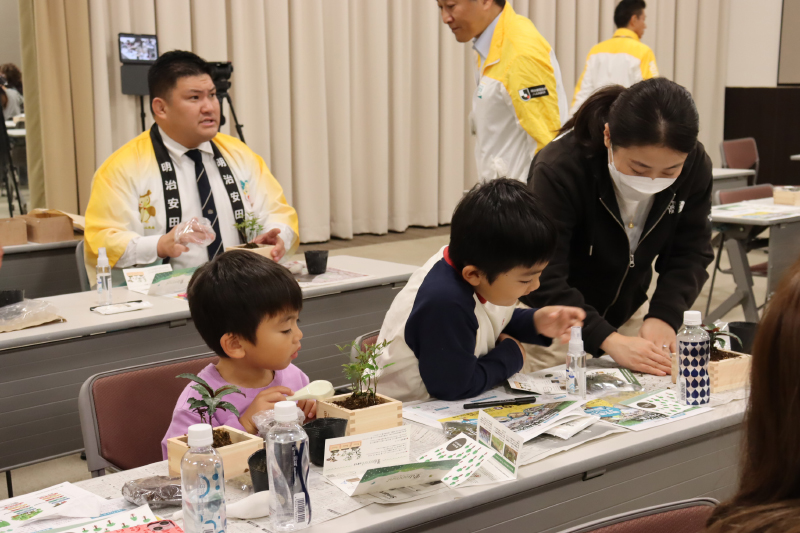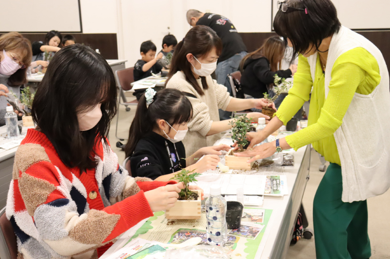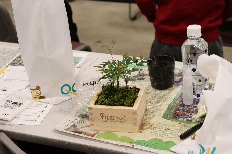 11月15日(土)、明治安田生命保険相互会社さまがイオンモール甲府昭和 イオンホールにて、里山BONSAIワークショップを開催されました。昨年に引き続き2回目の開催で、里山由来の苗木を使った「里山BONSAI」ワークショップです。当日は明治安田のお客様や社員様が親子で会場を訪れ、総勢70名ほどがワークショップを楽しんでくださいました!
