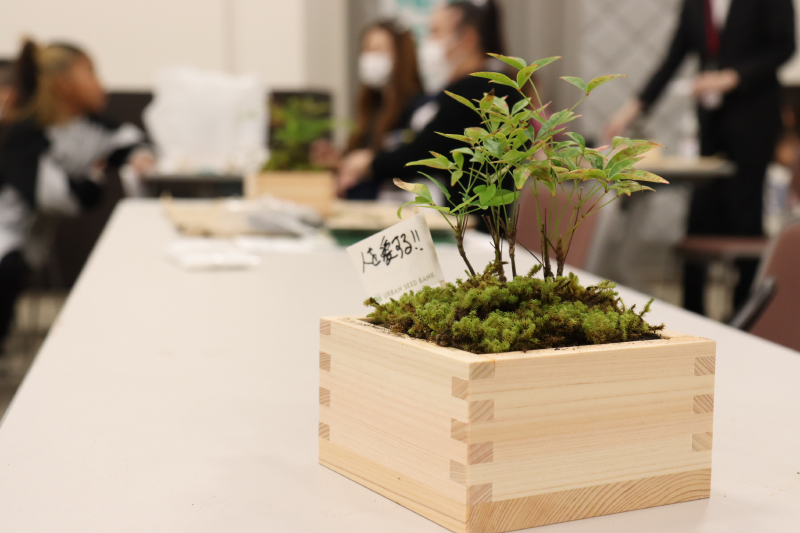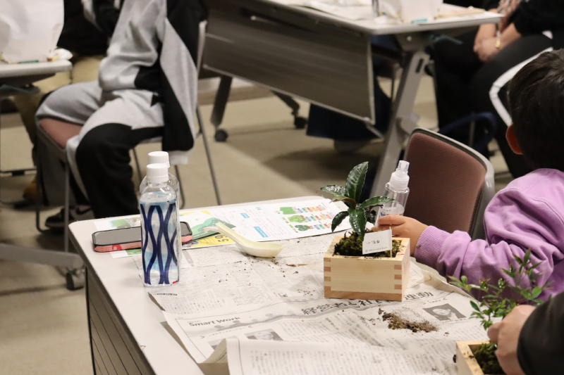 森を守るには人が手を入れていく必要があることをしっかりと学んでいただいてから、お待ちかねの「里山BONSAI」づくりに入ります。事務局長の石森が、里山BONSAIの作り方をレクチャー。スタッフが各テーブルを回りながら、作業の補助をします。